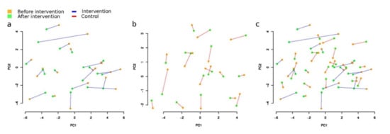 General changes of microbiome composition after the intervention (Aitchison distance): (a) intervention (Group A) (PERMANOVA p = 0.01, R2 = 0.88%); (b) control (Group B), (p = 0.571, R2 = 0.27%); (c) intervention and control groups combined. Please note that the red dots denote the samples before the intervention, and the blue dots, after.