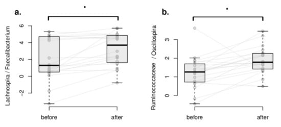 Within-group differential abundance analysis using DBA. Microbial balances associated with the plant-based intervention. (a) Lachnospira/Faecalibacterium balance. (b) Ruminococcaceae/Oscillospira balance. Dots denote associations very close to significance (FDR < 0.06).