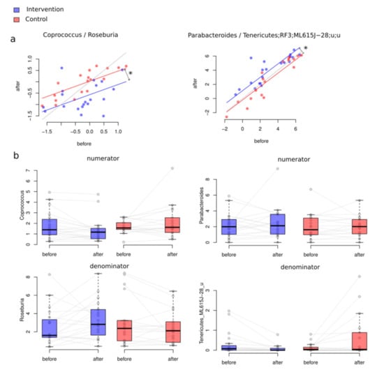 (a) Between-group differential abundance analysis results. Significantly changed balance values before and after the intervention in both the control and the intervention groups. Figure interpretation is as follows: There is one point per participant. If the point is under the grey line, for the participant, the balance decreased. If the point is above the line, the balance increased. Asterisks denote significant associations (FDR < 0.05). (b) The relative abundance of the taxa included in numerators and denominators of significantly changed balances (%). If we consider these relative abundances, it can be suggested that the main impact in the second balance was provided by unclassified Tenericutes.