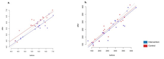 - ANCOVA analysis for each balance using the following formula:(balance after intervention) ~ intercept + (balance before intervention) + group