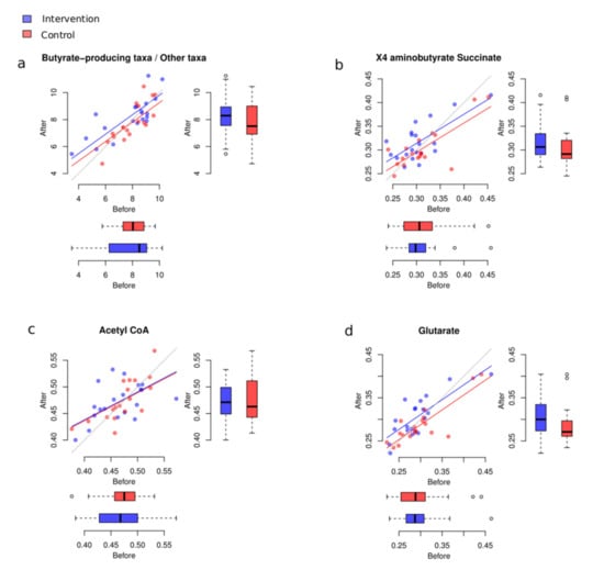 In the balances concept, the numerator of the balances (Lachnospira and Ruminococcaceae unclassified) increased in relation to the denominator taxa (Faecalibacterium and Oscillospira, respectively) in the intervention group. Interestingly, both numerator and denominator members include butyrate producers [,,,,] and taxa associated with healthy dietary patterns.