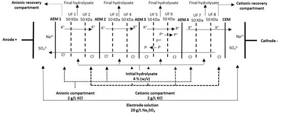 - Thibodeau, J.; Benoit, N.; Perreault, V.; Bazinet, L. Scale-Up and Long-Term Study of Electrodialysis with Ultrafiltration Membrane (EDUF) for the Separation of a Herring Milt Hydrolysate. Membranes 2021, 11, 558. [Google Scholar] [CrossRef] [PubMed]