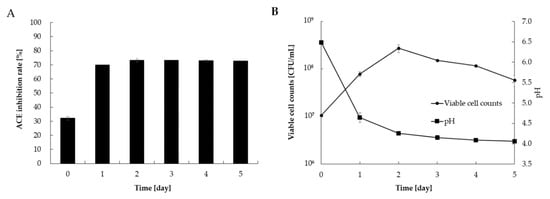 Angiotensin-converting enzyme (ACE) inhibition rate (A), and viable cell counts of L. casei 001 and pH (B) of L. casei 001-fermented Hidakakombu. (Final concentration: 0.83 [mg/mL]) (mean ± standard deviation (SD), n = 4).