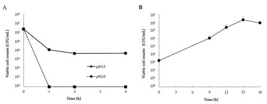 Ten percent of the total amount of L. casei 001-fermented Hidakakombu powder was added to ILS medium adjusted to pH 2.0 and pH 3.5 using 1 N HCl, and pepsin was added (final concentration: 0.04%). This was readjusted to a predetermined pH using 1 N HCl and incubated at 37 °C. Samples were tested over time (0, 1, 2, and 4 h) and used for viable cell count measurements. Viable cell counts were measured by serial dilution of the samples and plating on Plate Count Agar with BCP “Nissui”.