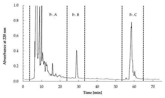 The aqueous extract of L. casei 001-fermented Hidakakombu was fractionated into four fractions (>30 kDa, 30–10 kDa, 10–3 kDa, and <3 kDa). The IC50 values of all fractions were calculated to evaluate ACE inhibitory activity. The results of molecular weight fractionation are shown in Table 1. Fractions less than 3 kDa showed the strongest ACE inhibitory activity. Therefore, fractions of less than 3 kDa were used for HPLC and separated using an ODS-120T column (7.8 × 300 mm) (TOSOH, Inc., Tokyo, Japan) into three fractions (Fr. A to Fr. C) with absorption at 220 nm.