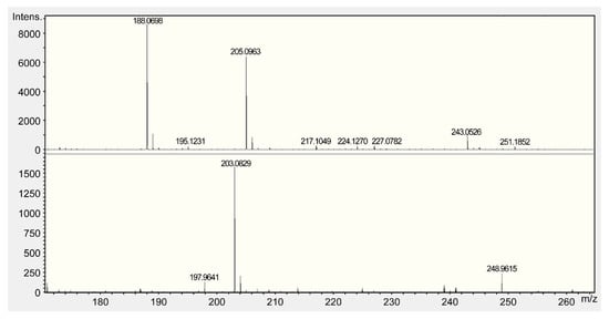 All fractions were evaluated for ACE inhibitory activity by calculating IC50 values; HPLC results are shown in Figure 3 and Table 2. Among these fractions, Fr. B showed the strongest ACE inhibitory activity (IC50 = 0.073 mg/mL). The MS spectra are shown in Figure 4. Fr. B was isolated as a white powder. The molecular formula of Fr. B was determined as C11H12N2O2 based on the ion peaks observed in the negative mode mass spectra, m/z 203.0829 ([M−H]−, Δ + 0.3 mmu), and positive mode spectra, m/z 205.0963 ([M + H]+, Δ − 0.9 mmu). The NMR spectra and data assignments are shown in Figure 5 and Table 3. Analysis of the 1H NMR and HSQC spectra revealed the existence of five aromatic methines (7.2–7.8 ppm), one methylene (3.1–3.5 ppm), and one methine (3.96 ppm) moieties in the molecule. 1 H–1 H COSY and HMBC analyses revealed that Fr. B was an α-amino acid tryptophan (Trp). The optical rotation [α]D20 of Fr. B was +40° (c = 2.5 mg/mL, H2O). Thus, Fr. B was determined as D-Trp.