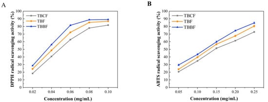 DPPH (A) and ABTS (B) radical scavenging activities of TBF, TBCF, and TBBF (TBF: Tartary buckwheat flour; TBCF: Tartary buckwheat core flour; TBBF: Tartary buckwheat bran flour).