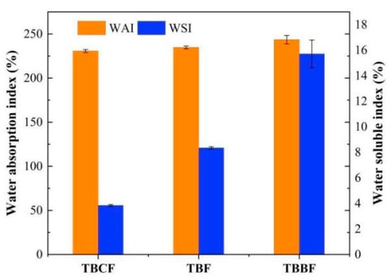 WAI represents the water-holding capacity of the sample, while WSI reflects the solubility of the sample in water [28]. It could be observed from Figure 3 that there is no significant difference in WAI among the samples, but there was a significant difference in their WSI (p < 0.05) with the order of TBBF > TBCF > TBF. The outstanding performance of TBBF might be attributed to its high protein content.