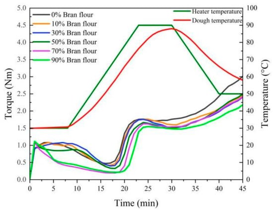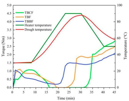 The dough rheological properties of TBF, TBBF, TBCF, and TBBF-WF flour blend (Wbran = 0, 10, 30, 50, 70, and 90%) were measured by a Mixolab 2 apparatus (Chopin, Paris, France) based on the “Chopin+” protocol. The dough weight was set at 75 g, and the amount of water added was corrected based on 14% moisture content, which made the dough produce the torque of 1.1 ± 0.5 Nm at the mixing speed of 80 rpm. The protocol was run for a total of 45 min, including three stages: (1) Constant temperature stage, the dough was mixed at the speed of 80 rpm at 30 °C for 8 min; (2) Heating stage, the dough was heated to 90 °C at a rate of 4 °C/min in 15 min and kept for 7 min; (3) Cooling stage, the dough was cooled to 50 °C at a rate of 4 °C/min in 10 min and held for 5 min.