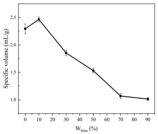 The color and specific volume of steamed bread is an indispensable part that determines the sensory quality of steamed bread, which directly affects the acceptance of consumers [29]. The effect of Wbran on the color difference of steamed bread was investigated (Table 6). With the increase of Wbran, L* decreased significantly, and the values of a* and b* increased at first and then decreased, indicating that the color of the steamed bread gradually darkened and yellowed, which could be related to the yellowish green of TBBF itself. Figure 6 demonstrated the effect of Wbran on the specific volume of steamed bread. With the increase of Wbran, the specific volume of steamed bread declined gradually. For the steamed breads developed at Wbran = 70% and 90%, their specific volumes had no difference (p > 0.05), which was close to 1. It may be due to the dilution effect of TBBF on gluten protein, which hindered the formation of gluten network, resulting in the decrease of dough expansion and the reduction of steamed bread volume during fermentation.