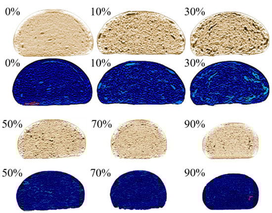 C-Cell image analyzer is a quality control system of fermented flour products based on computer recognition technology. Through image processing of sample slices, it can obtain the characteristic parameters of cells and slices, and comprehensively evaluate the internal texture structure of products [30]. Figure 7 shows the C-Cell images of steamed bread with different Wbran values, the corresponding parameters were summarized in Table 8. With the increase of Wbran, the slice area, brightness, and cell area of steamed bread decreased, cell contrast, cell number, cell elongation, and cell density decreased at first and then increased, while cell diameter, wall thickness, cell volume, and coarse cell volume increased at first and then decreased. The addition of TBBF at the level of 10% and 30% could reduce the texture of steamed bread. When Wbran ≥ 50%, the air-holding property of the dough decreased during the fermentation process, leading to a tighter tissue and a sandy interior of the steamed bread. After 10%, the addition of TBBF could make the cell wall thinner, improve cell contrast, and weaken the gloss of steamed bread.