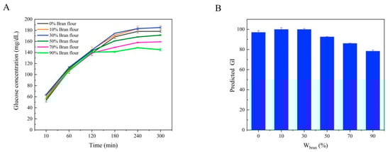 The glycemic index (GI) of food is used to reflect the effect of carbohydrates in food on blood glucose concentration [31]. Foods with high GI can be digested quickly and have a high absorption rate after entering the gastrointestinal tract, resulting in a rapid rise in blood glucose concentration. Foods with low GI stay in the gastrointestinal tract for a long time and have a low absorption rate, which leads to a slow rise in blood glucose concentration. Studies have shown that low-GI foods can improve blood glucose control in patients with diabetes and play a positive role in the prevention of cardiovascular diseases [32]. However, the determination of GI value is more complicated, and the NutriScan GI20 glycemic index analyzer can real-time track the hydrolysis of starch during simulated digestion of food and convert the results into the predicted GI value (pGI). The effect of Wbran on starch hydrolysis during steamed bread digestion is shown in Figure 8A.