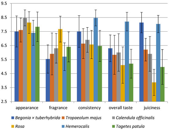 Statistically significant differences were found in: appearance (C. officinalis vs. Begonia × tuberhybrida and T. majus and Hemerocallis), fragrance (Rosa vs. all species), consistency (Hemerocallis vs. all species, Begonia × tuberhybrida vs. T. patula and Rosa), overall taste (Hemerocallis vs. all species, Begonia × tuberhybrida vs. Rosa and T. patula), juiciness (T. majus vs. C. officinalis, Hemerocallis vs. Begonia × tuberhybrida, T. patula vs. Rosa and C. officinalis and T. majus) (p < 0.05).