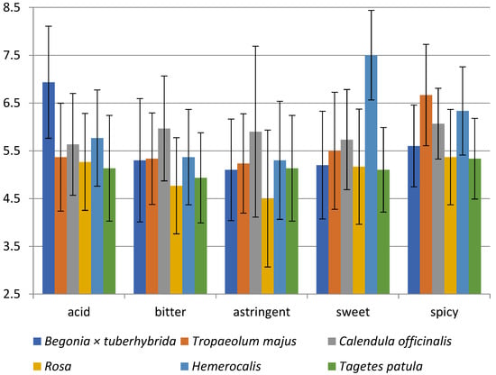 Figure 2 shows the sensory analysis results on the five various taste qualities-sweet, acid, bitter, astringent, and spicy. If the blossom received 9 points in the sensory analysis of taste, it did not contain the evaluated taste; for example, it was not sweet at all. The sourness intensity ratings were slightly acidic in all flowers; the range of gained points was from 5.1 to 6.9. Besides, Begonia × tuberhybrida was evaluated as the least acidic (6.9).