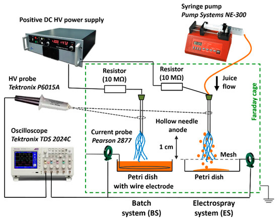 A DC-driven positive transient spark (TS) discharge in direct contact with the juice was generated in ambient air at atmospheric pressure in two different system set-ups, which are depicted in Figure 1. A transient spark discharge is a self-pulsing repetitive streamer-to-spark discharge with a very short duration of a strong spark current pulse with the repetitive frequency of ~1 kHz, which was described in detail in our previous work [45]. Both systems are based on a point-to-plane geometry using a sharp hollow needle as the high voltage anode made of stainless, chromium-nickel steel (Ø 0.8 mm × 40 mm, Sterican®, B.Braun, Melsungen, Germany). In the electrospray system (ES), the juice flowed directly through the needle with a constant flow rate thanks to the syringe pump (NE-300 Pump Systems Inc., Franklin, NH, USA) and it was collected into a sterile Petri dish (Ø 5 cm) below the grounded, stainless steel mesh electrode. Due to the high applied voltage, the effect of the electrospraying of the juice at the micrometric size (20–200 µm), droplets occurred. The ES set-up enabled the activation of the juice droplets that were sprayed directly in the discharge active zone in a similar way as previously investigated with water [46,47]. The batch system (BS) was based on the batch treatment using the TS discharge that was generated directly over the juice placed in the sterile Petri dish (Ø 5 cm) in which the grounded stainless steel wire electrode was submerged. The distance of 1 cm was kept in both systems between the needle tip and the mesh cathode (ES) or the juice surface (BS). Electrical discharge parameters were measured using a high voltage probe P6015A (Tektronix, Beaverton, OR, USA) and a Rogowski current monitor Pearson Electronics 2877 (USA). The typical applied high voltage was 11–13 kV for both systems with longer (~200 ns) current pulses of ~5 A amplitude for the BS and shorter (~50 ns) pulses of ~20–25 A for the ES. Despite these differences, the mean power for both systems was similar, in the range 1.5–2 W. Air TS generates cold non-equilibrium plasma at relatively low gas temperatures ~400–500 K [48,49], which does not increase the temperature of the treated liquids above room temperature and, therefore, thermal effects on the juice can be neglected.