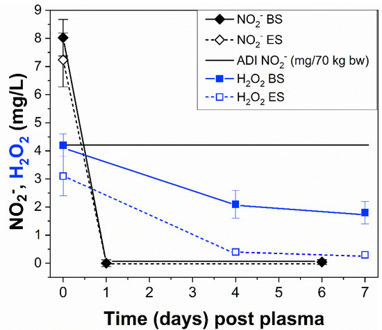 Long-lived RONS (NO2−, NO3−, and H2O2) are typically produced in liquids that are treated using cold air plasmas. Concentrations of NO2−, NO3−, and H2O2 in the apple juice treated using both ES and BS under previously described conditions were monitored over one week post plasma treatment while the juice was stored at 4 °C. According to the regulations of the Scientific Committee for Food, the values of acceptable daily intake (ADI) per kilogram of body weight (bw) are defined as 0–3.7 mg of nitrate ions (NO3−) and 0–0.06 mg of nitrite ions (NO2−). These ADIs are applicable to all sources of dietary exposure [58]. The measured concentrations of NO3− ions in the juice directly post plasma treatment (day 0) were already significantly lower (~10–11 mg/L) for both plasma systems than the maximal ADI (259 mg) calculated per average 70 kg human bw, assuming an exaggerated juice consumption of 1 L/day-person. In contrast, the concentrations of NO2− ions immediately post plasma treatment were higher (~7–8 mg/L) than the calculated maximal ADI (4.2 mg)/70 kg bw, as shown in Figure 2. Nevertheless, the concentration of the measured NO2− significantly dropped to zero 24 h post plasma exposure for both ES and BS and remained unchanged even after six days. It is worth mentioning that the ADI values were estimated with the margin of safety (MOS) of 500 for nitrate ions and 100 for nitrite ions.