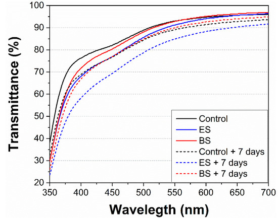 Comparison of the juice transmittance in the visible region immediately and 7 days post plasma exposure (+ 7 days) in the electrospray system (ES) and the batch system (BS).