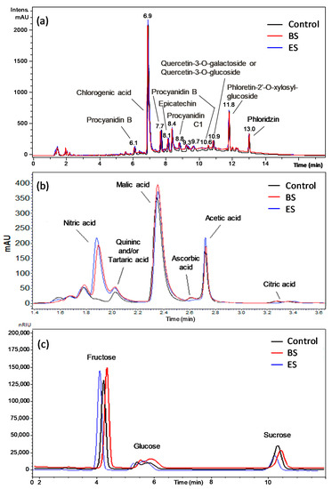 HPLC analyses of the untreated (control), batch system (BS)-treated, and electrospray system (ES)-treated apple juice samples using instrumental conditions to detect (a) polyphenols, (b) organic acids, and (c) sugars (see the Material and Methods, Section 2.5 for details).