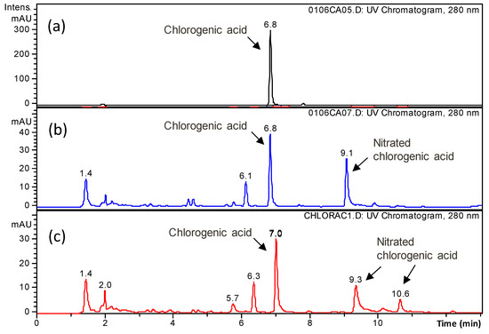 In the case of ascorbic acid, no products that were detectable under the same chromatographic analysis conditions employed appeared. In contrast, in the case of polyphenols, additional peaks due to the degradation products appeared in the chromatograms of the treated samples. In Figure 6, the UV chromatograms (280 nm) relative to the untreated and plasma-treated solutions of chlorogenic acid are shown as examples. From the MS spectra, two of the main peaks were ascribed to nitrated chlorogenic acid. In the case of treated phloridzin, hydroxylated and nitrated phloridzin were identified. In contrast, it was not possible to detect any degradation products of epicatechin.