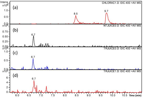 Before undertaking a more extensive investigation on the transformation products of ascorbic acid and polyphenols that were induced by the BS and ES plasma treatments, the hydroxylated and/or nitrated species of chlorogenic acid and phloridzin that were identified after the individual treatment of the two polyphenols were specifically examined in the samples of plasma-treated apple juice. Toward this aim, the signals of the ions originating from hydroxylated and nitrated polyphenols in the ESI-MS spectra were extracted from the total ion current acquired in the analyses of the treated juice samples. Assuming that the hydroxylated and nitrated species give the same instrumental response as their precursor, this procedure would allow for detecting a minimum concentration of 10−7 M. As shown in Figure 7, while two isomers of nitrated chlorogenic acid ([M + H]+, m/z 400, retention times 8.4 and 9.7 min) were detected when the chlorogenic acid solution was individually treated using plasma (Figure 7a), no signal attributable to nitrated chlorogenic acid was present in the ES-treated (Figure 7c) or BS-treated (Figure 7d) apple juice. Moreover, a compound with an identical m/z signal but different retention time (6.7 min) was observed both in the untreated (Figure 7b) and the treated juice (Figure 7c,d). Its presence both in the untreated and treated juice, combined with the fact that had a retention time that was different from nitrated chlorogenic acid, confirmed that it was due to a species with no relation to nitrated chlorogenic acid nor with the plasma treatment. Hydroxylated and nitrated phloridzin were similarly searched in the experimental data analysis and they also were not detected in the plasma-treated juice samples.
