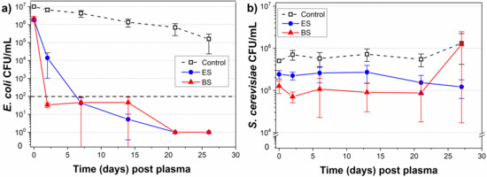 The results of the microorganism inactivation rates are presented in Figure 8. In both systems, the initial relatively low (<1 log) inactivation of E. coli immediately post plasma exposure was followed by a significant decrease in bacterial load within the first two days post plasma exposure (3 and 5 log reduction for ES and BS, respectively). This decrease reached a complete inactivation in both systems after twenty days and remained unchanged up to the 26th day (Figure 8a). The efficiency of inactivation of the yeast S. cerevisiae remained quite low over 26 days (~0.5 log), while slightly higher (~1 log) for the BS (Figure 8b). The transient spark in ambient air treatment with the electrospray system induced a very strong bactericidal effect due to the significant production of reactive species linked with the chemical changes in the treated solutions. Here we observed a much weaker immediate inactivation effect of E. coli bacteria (<1 log) than in our previous works with water (up to 7 logs), especially for the ES [46,47]. This difference was probably due to the shorter plasma exposure time per milliliter of juice and the specific juice composition, which seemed to inhibit the plasma inactivation effects in a similar way as the pH and chemical modification buffer. Despite this, the significant increase in the inactivation effect was observed 48 h post plasma exposure, which could be potentially attributed to the synergic effect of the acidic pH of the juice, the presence of the long-lived RONS, and the lower temperature during the juice storage, as was similarly shown by Surowsky et al. [25]. The relatively weak inactivation effect of the S. cerevisiae yeasts could be attributed to their different and more complex cell composition, which made them more resistant to the cold atmospheric plasma [30]. However, the high initial microbial load in our experiments (~105–107 CFU/mL) surpassed the naturally presented contamination by native pathogens by several orders of magnitude. As was shown by Shi et al. [16], the original load of native pathogens in the freshly squeezed orange juice was determined to be 3.20 × 102 CFU/mL. A similar result was observed by Chutia et al. [33], who determined the aerobic microbial load in the tender coconut water to be 1.5–1.75 × 102 CFU/mL. Hence, with these naturally lower microbial loads of 101–102 CFU/mL, we expected a much stronger plasma inactivation effect (especially for yeast inactivation).