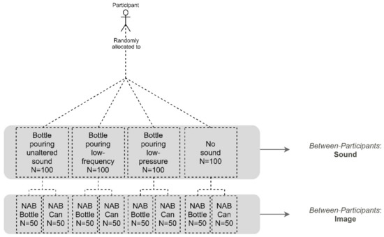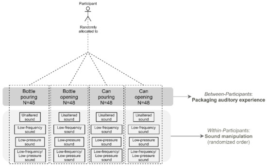 As shown in Figure 1, Experiment 1 was based on a mixed-model experimental design. Here, four between-participants conditions were implemented. These conditions included a sound representing a typical beer packaging auditory experience (bottle pouring, bottle opening, can pouring, and can opening). For each between-participants condition, each participant was exposed to four versions of the same sound manipulated in terms of frequency and sound pressure (unaltered, low-frequency, low-pressure, and low-frequency/low-pressure sound).