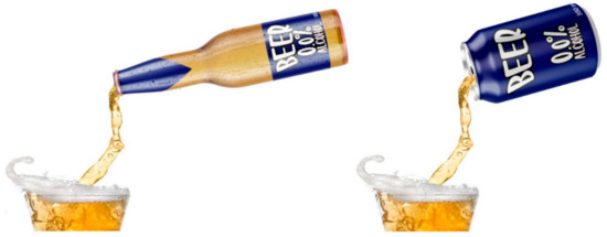 Each of the chosen three experimental sounds were presented with a customized NAB brand-free image, representing a digital NAB experience of beer poured into glassware (see Figure 3 for both bottle and can versions of NAB used in Experiment 2). The labels had a blue background since NAB versions of most well-known beer brands usually include this color as part of their labeling. Importantly, blue background labels usually represent lighter and healthier product versions [34,35,36]. This experimental label also contained information that the poured product was a 0.0% alcohol type of beer (NAB). Both images were produced using Adobe Photoshop CS6 software and relied on baseline images under creative commons licensing.