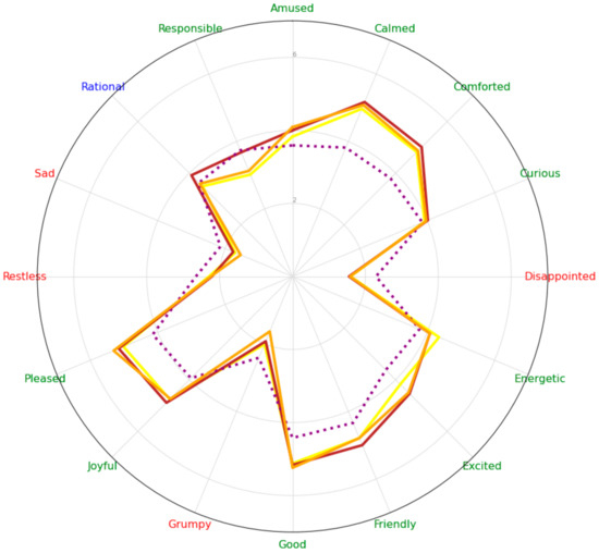 Table 1 shows the univariate tests at the within-participants level (Greenhouse–Geisser-corrected). There was a main effect of sound manipulation on specific positive (amused (p < 0.01), comforted (p < 0.01), curious (p < 0.01), energetic (p < 0.01), excited (p < 0.01), friendly (p < 0.01), good (p < 0.01), joyful (p < 0.01), pleased (p < 0.01), and responsible (p < 0.05)) and negative (disappointed (p < 0.01), grumpy (p < 0.05)) emotion scores. No effects of sound manipulation were found for calmed, restless, and rational scores.