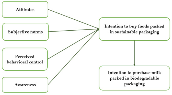 However, positive environmental attitudes are not able to predict the behavior if social norms are not considered [48]. The importance that society places on environmental issues plays an important role in explaining sustainable consumption behavior as well [31]. Specifically, the subjective norm is defined as the personal perception of the social pressure to behave in a certain way or not [29]. Then, consumers who perceive high social pressure to preserve the environment, by the use of sustainable packaging with undefined material or disposing packages in a correct way, could be also more willing to purchase foods packaged in sustainable solutions [31,36,48,49,50].