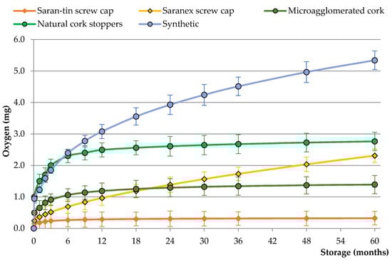 The barrier properties of cork stoppers present a better performance when compared with synthetic closures; however, oxygen ingress varies according to the type of cork stoppers (technical or natural) [3,19,20]. Thus, the oxygen ingress into bottles sealed with technical corks such as microagglomerate corks varies between 1.0 and 1.3 mg over time (Figure 1). Most of this oxygen diffuses out of the cork, due to the compression on the bottleneck, during the first six months of storage. After this period, the OTR throughout cork–glass interface or throughout the cork seems to be negligible, exhibiting values similar to the Saran-tin screw caps [17,35].