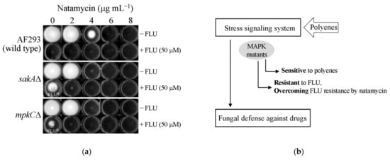 (a) The level of fungal growth without or with the treatment of natamycin (NAT) (2, 4, 6, 8 μg mL−1) and/or fludioxonil (FLU) (50 μM) tested in A. fumigatus AF293 (wild type) and MAPK mutants (sakAΔ, mpkCΔ); (b) diagram: overcoming FLU tolerance of A. fumigatus MAPK mutants by combined application of NAT.