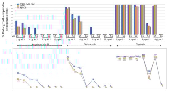 Susceptibility of A. fumigatus AF293 (wild type) and MAPK mutants (sakAΔ, mpkCΔ) to polyene drugs (amphotericin B (AMB), natamycin (NAT), nystatin (NYS); 2, 4, 8, 16 μg mL−1) tested in PDA (triplicate) at pH 3.5 or 5.6 (SD < 2%). Lower panel: Line graph showing numerical values of % radial growth at each test condition. (Note: While NAT showed higher antifungal activity than AMB at 4 μg mL−1 (pH 5.6), where NAT completely inhibited the growth of AF293, the 22% growth with AMB labeled in the graph indicated the appearance of scattered colonies only (not a full radial growth) of AF293.)