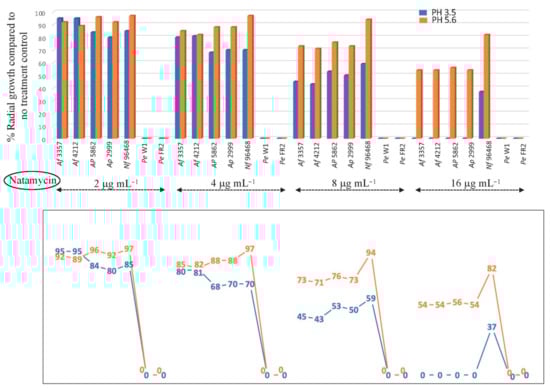 Susceptibility of foodborne fungal contaminants (Af, A. flavus; Ap, A. parasiticus; Nf, N. fischeri; Pe, P. expansum) to natamycin (NAT) (2, 4, 8, 16 μg mL−1) tested in PDA at pH 3.5 or 5.6 (triplicate) (SD < 2%). Lower panel: Line graph showing numerical values of % radial growth at each test condition.