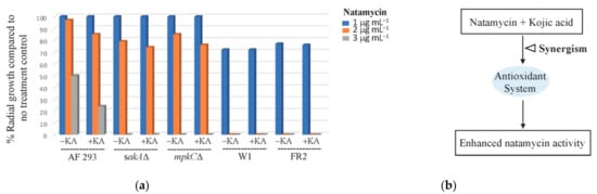 (a) The level of fungal growth without or with the treatment of natamycin (NAT) (1, 2, 3 μg mL−1) and/or kojic acid (KA) (5 mM) tested in A. fumigatus (AF293 (wild type), MAPK mutants (sakAΔ, mpkCΔ)) and P. expansum (W1 (wild type), FR2 (FLU-resistant mutant)) (triplicate) (SD < 2%); (b) diagram: enhanced NAT activity by combined application of KA.