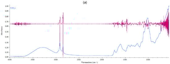 FT-IR raw (blue line) and derivative spectra (red line) of hop samples analyzed: (a) Latin hop sample (CAS_L) spectra; (b) Tuscan hop sample (CAS_T) spectra.