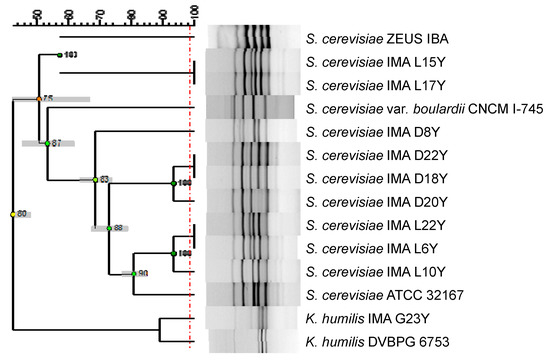 The phylogenetic relationship among the nine S. cerevisiae isolates, along with K. humilis IMA G23Y, the commercial baker’s yeast S. cerevisiae Zeus IBA, the commercial probiotic S. cerevisiae var. boulardii CNCM I-745 and the reference strains was assessed by inter-delta region analysis. Amplification reactions were performed using δ1 (5′-CAA AAT TCA CCT ATA/TTC TCA-3′) and δ2 (5′-GTG GAT TTT TAT TCC AAC A-3′) primers (Eurofins Genomics, Ebersberg, Germany) and 160 ng of DNA, as reported in Palla et al. [52]. All gels were visualized by UV and captured as TIFF format files by the UVI 1D v. 16.11a program for FIRE READER V4 gel documentation systems (Uvitec Cambridge, Eppendorf, Milan, Italy). Inter-delta profiles were digitally processed and analyzed with the BioNumerics software version 7.6 (Applied Maths, St-Martens-Latem, Belgium). Profiles were compared using the band matching tool with a position tolerance and optimization of 0.5%, and similarity was calculated using the Dice’s coefficient. For cluster analysis, unpaired group method with arithmetic average (UPGMA) trees with highest resampling support, in a permutation sample of size 200, were constructed. The reproducibility of fingerprints was assessed.