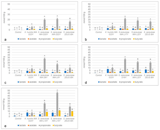 Yeast isolates were singly inoculated in doughs obtained using the appropriate flour, fermented at 30 °C for 24 h and analyzed for their ability to produce organic acids, such as lactic, acetic, propionic and butyric acid, by HPLC. Overall, all the fermented doughs showed a significantly higher content of the four acids than not inoculated doughs, where the production was almost absent (Figure 2 and Tables S2–S6). Among organic acids, propionic acid was the most abundant one. In particular, in fermented doughs inoculated with S. cerevisiae strains, propionic acid content ranged from 9.39 ± 2.44 mmol/100 g of dough in the blue-grained cv. Skorpion doughs inoculated with S. cerevisiae Zeus IBA (Figure 2c and Table S2) to 45.85 ± 2.31 mmol/100 g of dough in barley doughs inoculated with S. cerevisiae IMA L15Y (Figure 2e and Table S3). On the contrary, fermented doughs inoculated with the strain K. humilis IMA G23Y showed lower propionic acid contents, which ranged from 5.45 ± 2.75 to 9.60 ± 2.09 mmol/100 g of dough in conventional red-grained common wheat (Figure 2a and Table S4) and in emmer doughs (Figure 2d and Table S5), respectively. In the doughs inoculated with such a strain, lactic acid production resulted higher than in those obtained using S. cerevisiae strains. In particular, the highest lactate content was found in emmer (7.56 ± 0.13 mmol/100 g of dough) and in barley (7.27 ± 0.28 mmol/100 g of dough) doughs (Figure 2d and Table S5, Figure 2e and Table S3, respectively).