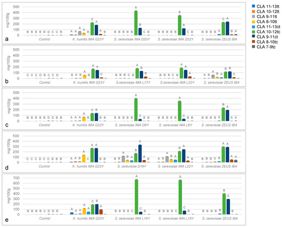 Histogram showing conjugated linoleic acid (CLA) (mg/100 g of total lipids) profiles of fermented doughs individually inoculated with the yeast strains, obtained using (a) conventional red-grained wheat variety T. aestivum L. cv Aubusson, (b) yellow-grained wheat variety T. aestivum L. cv Bona Vita, (c) blue-grained wheat variety T. aestivum L. cv Skorpion, (d) winter emmer variety Triticum turgidum subsp. dicoccum var. Schrank, Giovanni Paolo and (e) hull-less spring barley variety Hordeum vulgare L. var. nudum Hook, Rondo. A–D: means within CLA isomers with different letters significantly differ (p ≤ 0.01).