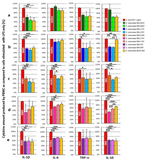 To study the anti-inflammatory capacity of fermented doughs obtained by inoculating the five different flours with the selected yeast strains, as well as with a commercial baker’s yeast, PBMC obtained from healthy blood donors were stimulated ex vivo with 1 μg/mL E. coli LPS for 24 h in the presence of water/salt soluble dough extracts. Pro-inflammatory (IL-1β, IL-6, TNF-α) and regulatory/anti-inflammatory (IL-10) cytokines were quantified in the culture supernatants and compared to those obtained in the culture conditions where PBMC were stimulated with LPS only. A vast majority of the extracts demonstrated the ability to decrease the cytokine production from LPS stimulated PBMC for most of the cytokines tested (Figure 4). In particular, the production of IL-1β, a strong pro-inflammatory cytokine mainly produced by monocytes upon LPS stimulation, was significantly decreased by ca. 50% in almost all yeast strain-dough combinations (Figure 4).