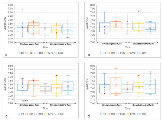 Boxplot showing the survival (Log cfu/mL) of 10 Saccharomyces cerevisiae strains under simulated gastric conditions (0–180 min) at pH 2.0 (a), 3.0 (b), 8.0 (c) and 2.0 with added reconstituted skim milk (10%) (d), and further intestinal digestion (180–360 min) at pH 8.0. Circles indicate the isolates; the red ones indicate the commercial probiotics’ yeast from Codex. Median values are reported (×). The top and the bottom of the box represent the 75th and 25th percentile of the data, respectively. The top and the bottom of the bars represent the 5th and the 95th percentile of the data, respectively.