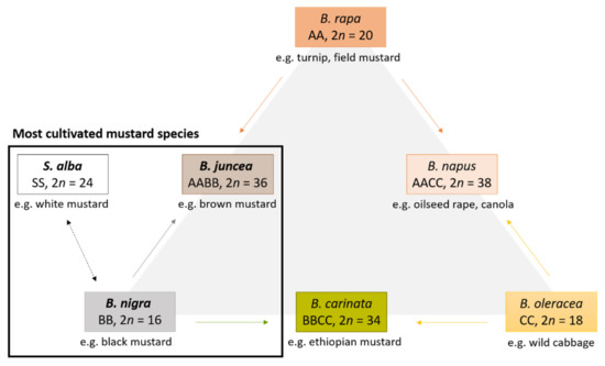 The most cultivated varieties within this family almost all belong to the six species Brassica rapa, Brassica juncea, Brassica nigra, Brassica carinata, Brassica oleracea and Brassica napus in which also two of three of the most important mustard species are included (B. juncea and B. nigra). Based on cytogenetic and hybridization experiments of the Korean botanist U Nagaharu (1935), a well-known model named “U’s triangle” have demonstrated the genetic relationship among these different species. The triangle is based on the theory that the genomes of three ancestral diploid species of Brassica combined to give rise to three common tetraploid vegetables and oilseed crop species. Figure 1 illustrates the triangle and shows the main forms B. rapa, B. nigra and B. oleracea with their own elementary genome A, B and C. The three amphidiploid species B. juncea (AB), B. napus (AC) and B. carinata (BC) are natural hybrids of the diploids. A genetic relationship exists also between B. nigra and the genera Sinapis L. in which the species Sinapis alba, belonging to one of the important mustard species, is included [1,3,4,5].