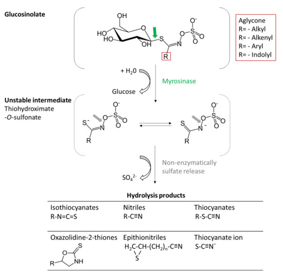 Most of the hydrophilic glucosinolates are chemically and thermically stable. However, they can be converted into diverse breakdown products by specific ß-thioglucosidases, referred to as myrosinases, which are present in glucosinolate-producing plants but also in fungi and in bacteria commonly associated with gut microflora [28,29] (Figure 2).
