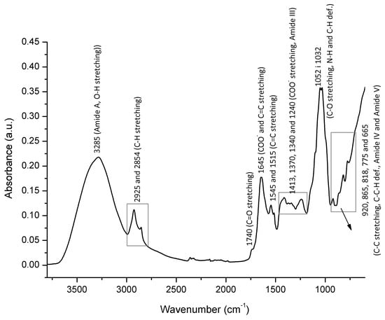 A typical FTIR-ATR spectrum of bee pollen is characterized by the broad absorption observed in the spectral range from 3600 to 3000 cm−1 with an absorption maximum at 3285 cm−1, which can be assigned to both N–H stretching vibrations of the protein structure (amide A band) [,], and O–H stretching vibrations of carbohydrates (primarily glucose, fructose, and sucrose) and water. Two IR absorptions, the medium intensity absorption band observed at 2925 cm−1 and the weaker one at 2854 cm−1, correspond to C–H stretching (aliphatic C–H groups) and can be described as non-specific IR signals given that they may be related to the molecular vibrations of numerous bee pollen constituents, such as lipids, fatty acids, carbohydrates, cellulose, and other long-chain structures [,,,,].
