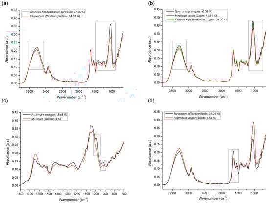 Comparative spectral features of bee pollen (FTIR-ATR spectra of unifloral bee pollen containing the highest vs. the lowest content of particular organic compound) with accentuated spectral regions indicative for the content of: proteins (a), sugars (b), sucrose (c), and lipids (d).