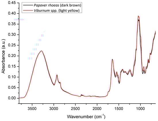 Comparative spectral features of bee pollen with regard to pigmentation (FTIR-ATR spectra of dark colored P. rhoeas vs. light colored Viburnum spp. bee pollen).