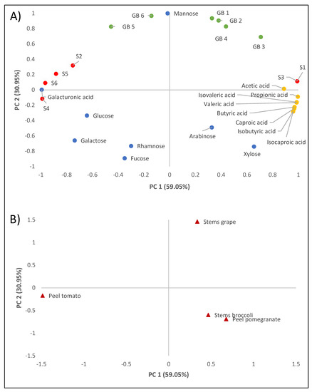 Principal component analysis of the analytical results of the dietary fibre extracts studied. Loading plot (A). GB1: growth of E. faecium SE 906; GB2: growth of E. faecium SE 920; GB3: growth of L. casei HL 245; GB4: growth of L. casei HL 233; GB5: growth of L. reuteri PL 503; GB6: growth of L. reuteri PL 519; S1: survival in the gastrointestinal tract of E. faecium SE 906; S2: survival in the gastrointestinal tract of E. faecium SE 920; S3: survival in the gastrointestinal tract of L. casei HL 245; S4: survival in the gastrointestinal tract of L. casei HL 233; S5: survival in the gastrointestinal tract of L. reuteri PL 503; S6: survival in the gastrointestinal tract of L. reuteri PL 519. Score plot (B). Grape stem, broccoli stem, pomegranate peel, and tomato peel samples.