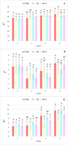 Figure 2. Color changes at days 0, 3, 6, and 8 of storage, in control (CTRL), sulphites (S), phenolic extract (PE), and phenolic extract + sulphites (PE+S) shrimps. Values are means ± standard deviation. Different uppercase letters, within each day of storage, represent significant differences between groups (p < 0.05); different lowercase letters, within each group, represent significant differences between days of storage (p < 0.05). L* (A), a* (B), and b* (C).
