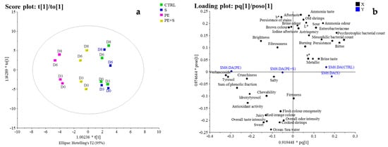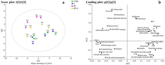 To confirm the qualitative differences among the samples according to the storage time and treatments, highlighted by PCA results, and to assess correlations between all the quality parameters and treatment types, an orthogonal partial least squares discriminant analysis (O-PLS-DA) was employed (58% total explained variance with a predictive component and an orthogonal component which explained 19% and 39%, respectively) (Figure 4). The score plot (Figure 4a) which projected the components T0 [1] vs. T1 showed a wider separation along the principal predictive component (from the left to the right side of the score), according to the shrimps’ treatment, as observed in the PCA score. In particular, we found PE samples located on the left of the score, CTRL and S on the opposite side, and the shrimps of the PE+S group in the middle of the score (Figure 4a). Furthermore, along the orthogonal component, (T [1], from the lower to the upper side of the score plot, Figure 4a), the objects (shrimps) separation was related to the time of storage with the D0 and D3 samples and D6 and D8 samples located in the lower and in the upper part of the score plot, respectively. In the relative Pq [1] vs. poso [1] loading plot (Figure 4b), we found high correlations between the independent variables verbascoside, tyrosol, hydroxytyrosol, the sum of the phenolic fraction and the antioxidant activity and the latent dependent variable represented by the PE shrimps (Figure 4b, left side). This confirmed the ability of the phenolic substances contained in the PE, to maintain high antioxidant activity of the shrimps’ cooked flesh as other researches have already demonstrated [22,45] during heating processes. Furthermore, the loading plot also shows high correlation between the latent variable representing PE shrimps and many of the sensory positive attributes such as crunchiness, brightness, sweetness, and juiciness (Figure 4b, left side). In contrast, the latent dependent variables S and CTRL samples showed low correlation with all the variables characterizing PE samples and high correlation with psychrotrophic and mesophilic bacteria and Enterobacteriaceae, that were negatively correlated with raw PE samples (Figure 4b, right side). Indeed, the presence of polyphenols in PE shrimps helped limit bacterial proliferation, confirming previous results [17].