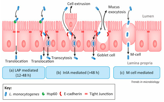 (a) In the LAP-dependent pathway, LAP (alcohol acetaldehyde dehydrogenase, AdhE) interacts with the host cell receptor and heat shock protein 60 (Hsp60) [48,49]. It activates NF-kB and myosin light chain kinase to retract epithelial tight junction proteins from the membrane leading to changes in intestinal permeability, and L. monocytogenes translocation across the epithelial barrier [50,51].