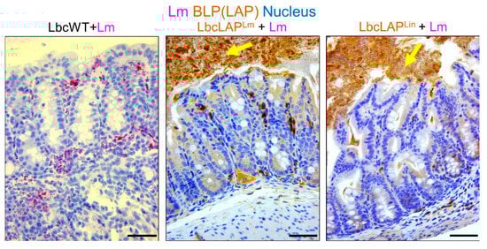 Biofilms formed (above) by recombinant Lactobacillus casei (Lbc) expressing Listeria Adhesion Protein (LAP) from L. monocytogenes (LbcLAPLm) or nonpathogenic L. innocua (LbcLAPLin) on mouse colonic villi after feeding for ten days (arrows). The wild-type Lactobacillus casei (LbcWT) did not show any biofilm formation (left panel). Bar, 25 µm. The figure was adapted with permission from Drolia et al. 2020 [51].